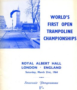 The first individual trampolining competitions were held in colleges and schools in the USA and then in Europe. In the early years of competition there was no defined format with performers often completing lengthy routines and even remounting if falling off partway through. Gradually competitions became more codified such that by the 1950s the 10-bounce routine was the norm thereby paving the way for the first World Championships which were organized by Ted Blake of Nissen, and held in London in 1964. The first World Champions were both American, Dan Millman and Judy Wills Cline ( both pictured to the right together with members of the Household Cavalry at the closing ceremony). Kurt Baechler of Switzerland and Ted Blake of England were the European pioneers and the first ever televised National Championships were held in England in 1958.